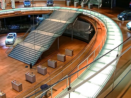 Komplette PR-Verglasung mit großen Scheiben im EG/1.OG mit Spezial-Kränen, sowie über 5000 Aussteifungs-„Glasschwerter“ etwa 5 m hoch bis in 30 m Höhe mit einem speziell hergestellten 2 stöckigen Außen-Fahrkorb